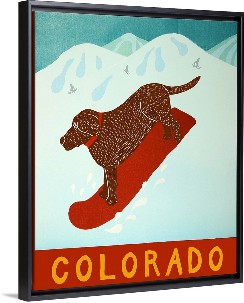 <p>Illustration of a chocolate lab going down the slopes in Colorado on a red snowboard.</p>
