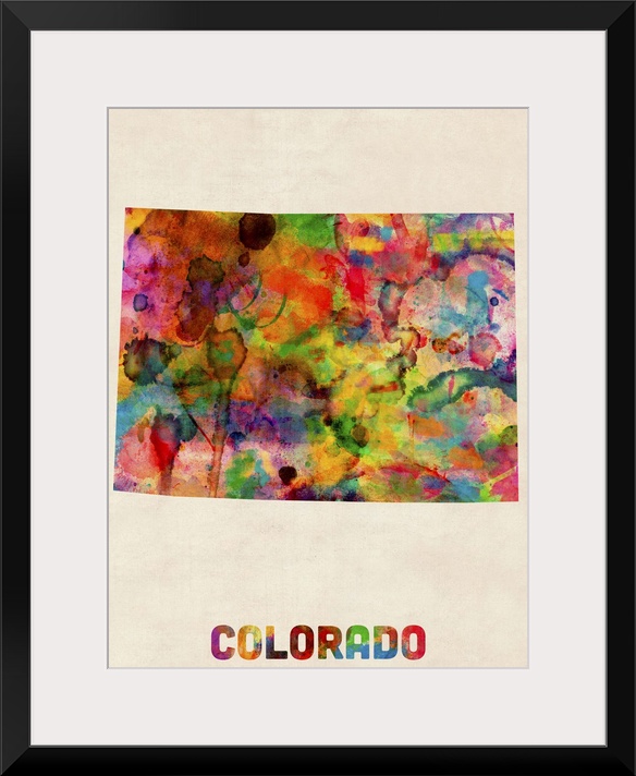 <p>Contemporary piece of artwork of a map of Colorado made up of watercolor splashes.</p>