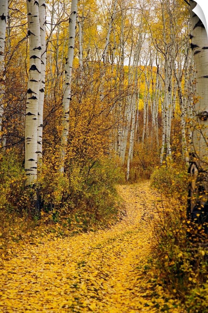 <p>A vertical photograph taken of a path in the forest lined with aspen trees and yellow leaves that have covered the ground.</p>