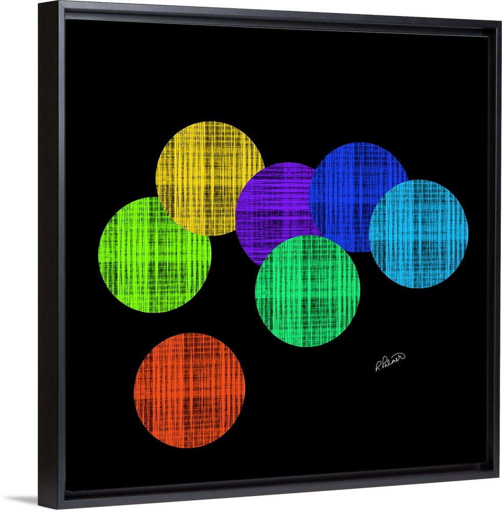 <p>Vibrant colored circles in a cross hatching pattern overlapping each other on a black backdrop.</p>