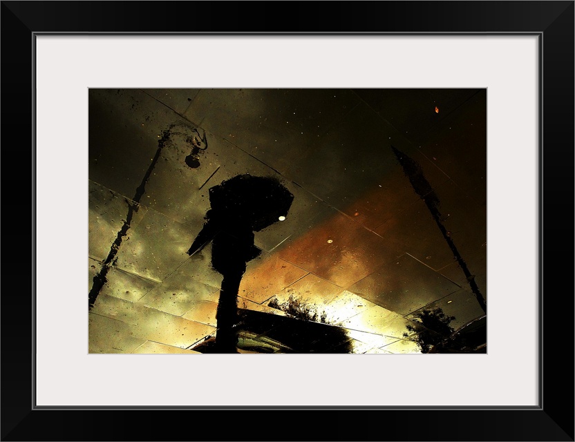 <p>Photo of the reflection of a figure with an umbrella, streetlights, and colors of the sunset, viewed upside down, but appearing to be right-side up.</p>