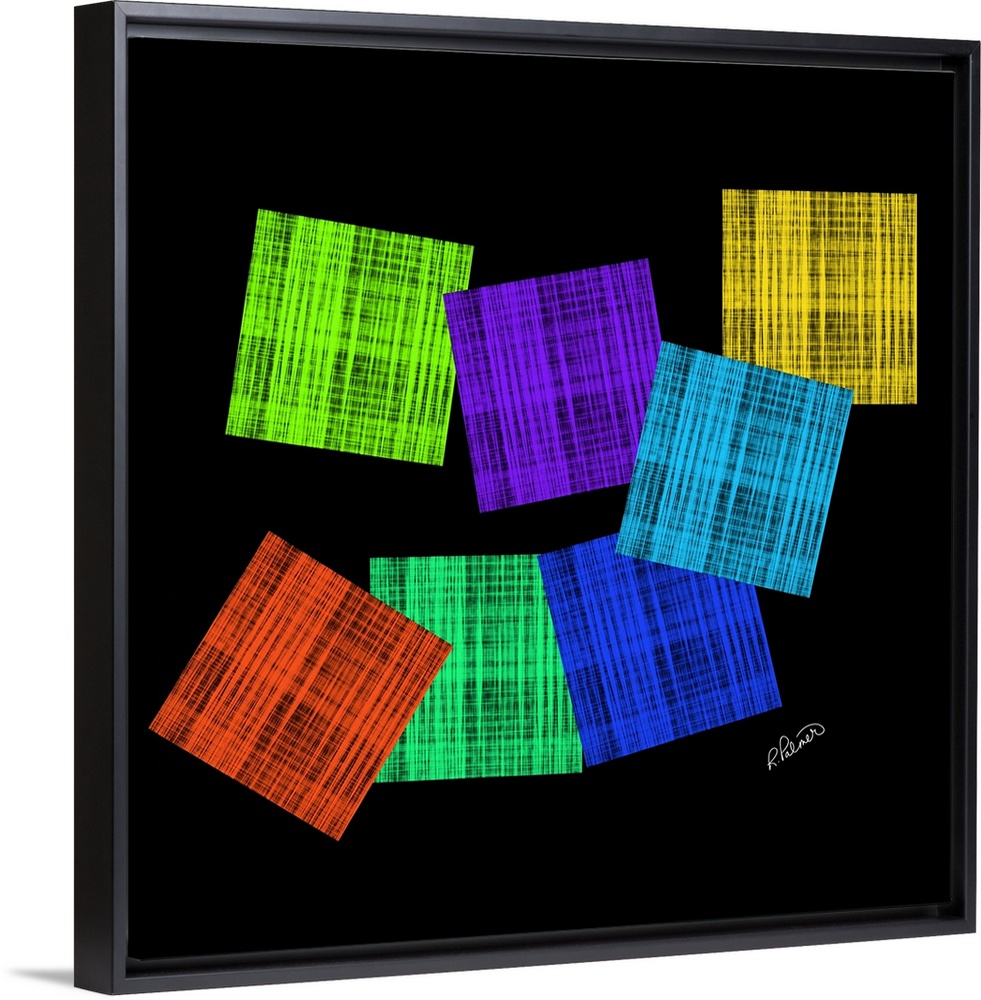<p>Vibrant colored boxes in a cross hatching pattern overlapping each other on a black backdrop.</p>