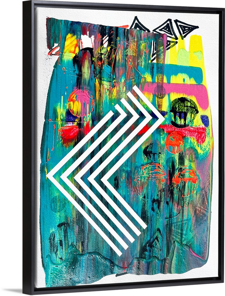 <p>Abstract expressionist painting with geometric color and lines invading the space in contrast with different elements: light, shadows, shape, texture and movement.</p>