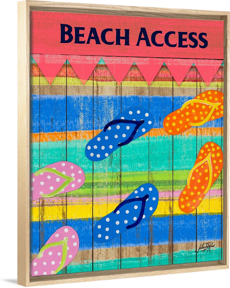 <p>Beach themed painting with polka dotted flip flops on a wooden background with colorful stripes and "Beach Access" written across the top.</p>