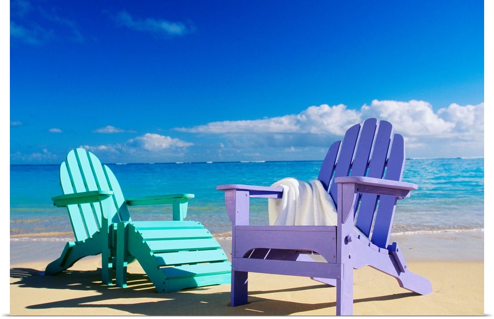 <p>Photograph of pastel colored chairs on the shoreline under a cloudy sky.</p>