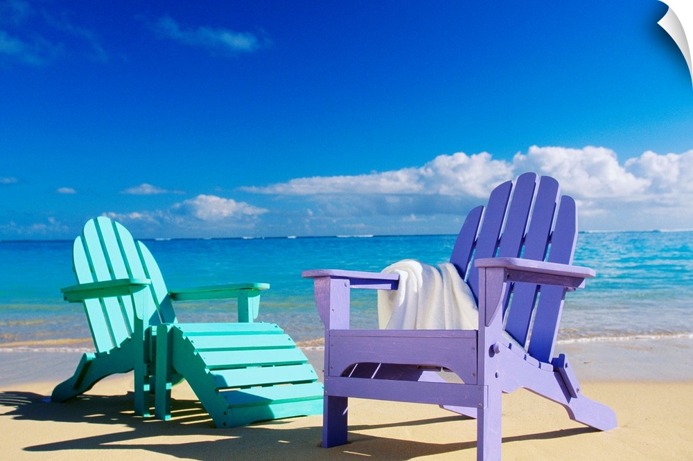 <p>Photograph of pastel colored chairs on the shoreline under a cloudy sky.</p>