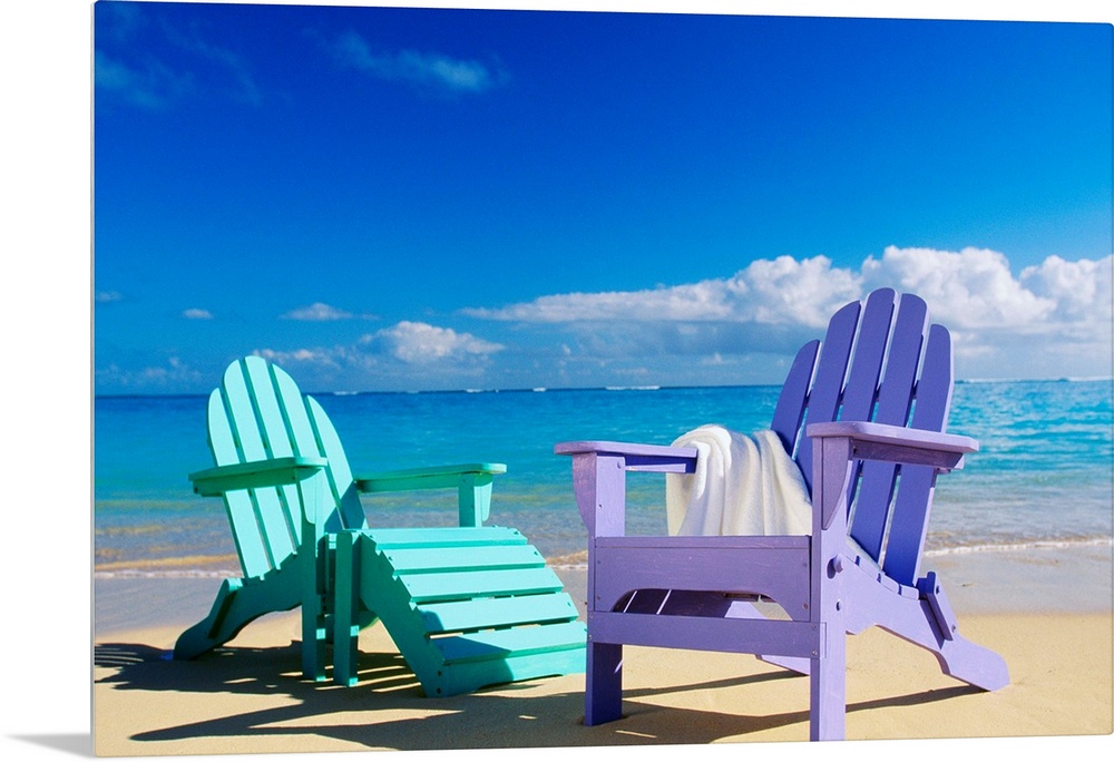 <p>Photograph of pastel colored chairs on the shoreline under a cloudy sky.</p>