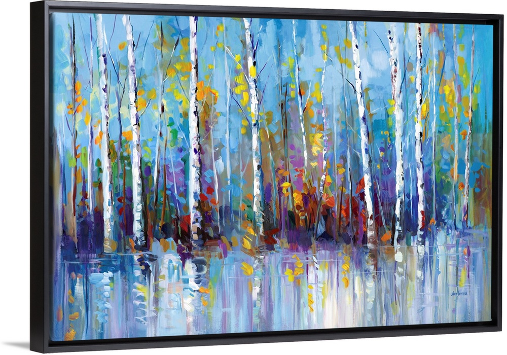 <p>Colorful abstract artwork of birch trees with vivid leaves, reflecting on a calm surface, creating a serene and lively scene.</p>