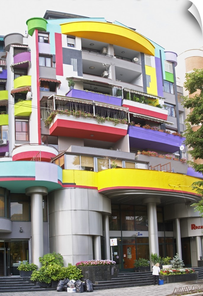 <p>A very colourful building. Street scene from the part of the city called The Block that used to be reserved for party dignitaries during the communist era. Tirana capital. Albania, Balkan, Europe.</p>