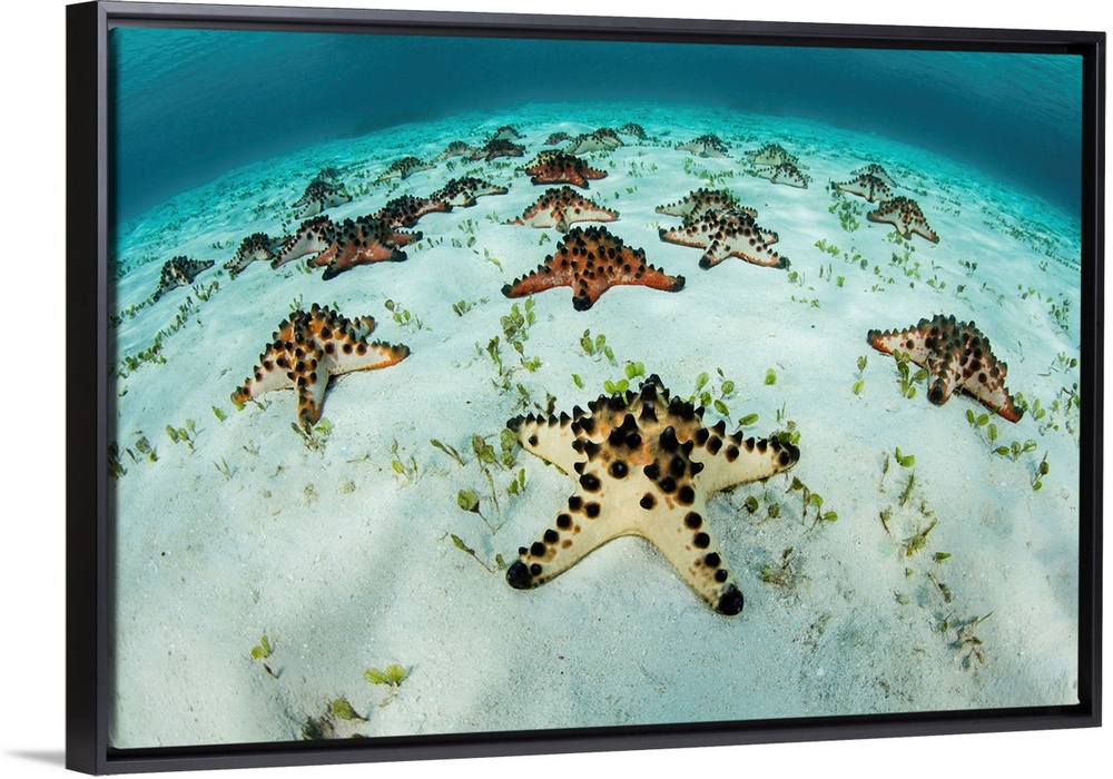 <p>Colorful chocolate chip sea stars lay on the shallow sandy seafloor of Raja Ampat.</p>