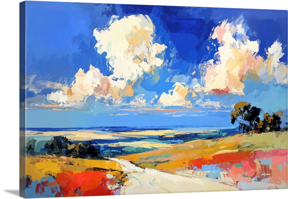 <p>A vibrant abstract landscape artwork featuring an open field beneath a dramatic blue sky filled with sweeping, expressive clouds. Bold strokes of yellow, red, teal, and soft beige flow across the land, creating a sense of movement, light, and depth throughout the scene. This artwork brings an uplifting, expansive feel to any home, perfect for those who love color, open spaces, and expressive landscapes.</p>