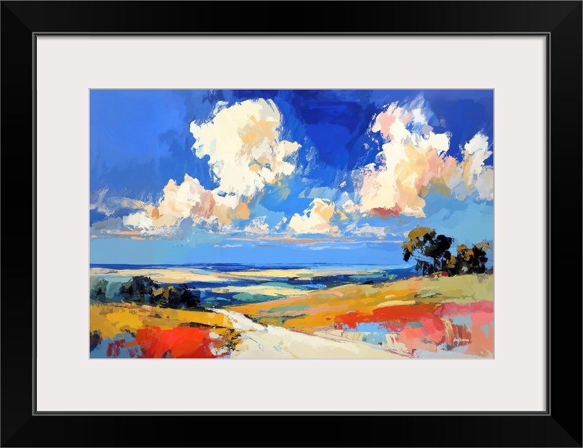<p>A vibrant abstract landscape artwork featuring an open field beneath a dramatic blue sky filled with sweeping, expressive clouds. Bold strokes of yellow, red, teal, and soft beige flow across the land, creating a sense of movement, light, and depth throughout the scene. This artwork brings an uplifting, expansive feel to any home, perfect for those who love color, open spaces, and expressive landscapes.</p>