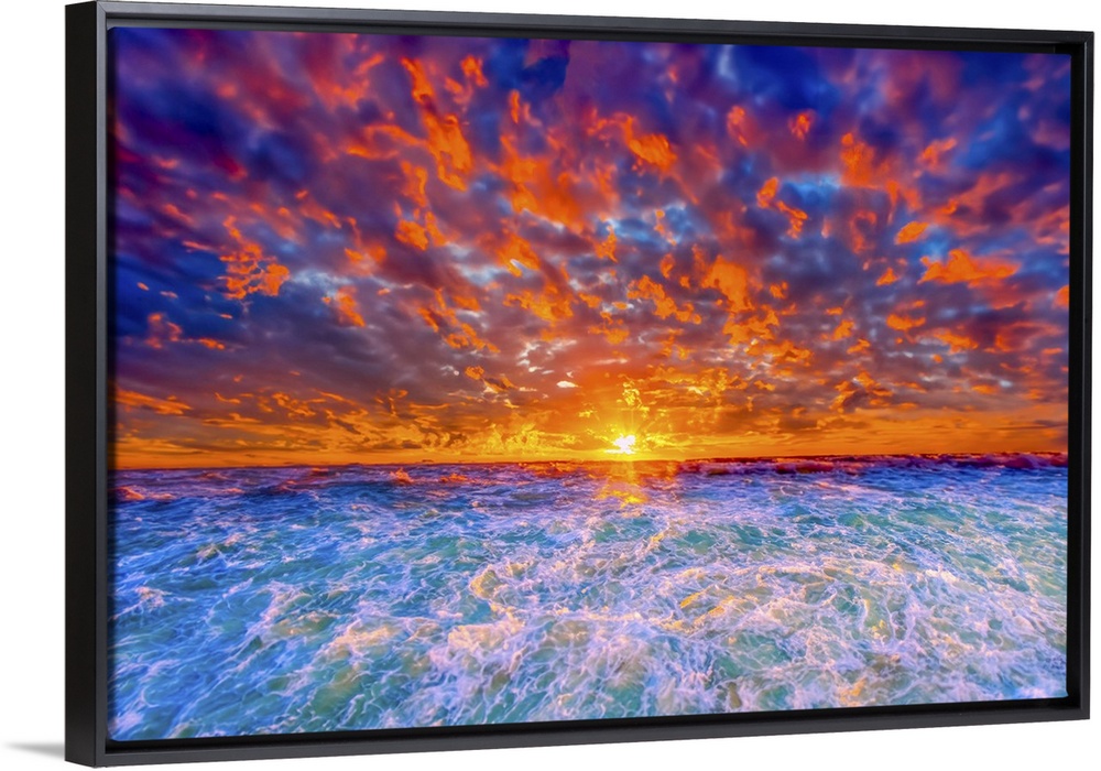 <p>A fiery red, orange, purple, and blue sunset explodes a into colorful sunset. Gold crested waves dance in the ocean below.</p>