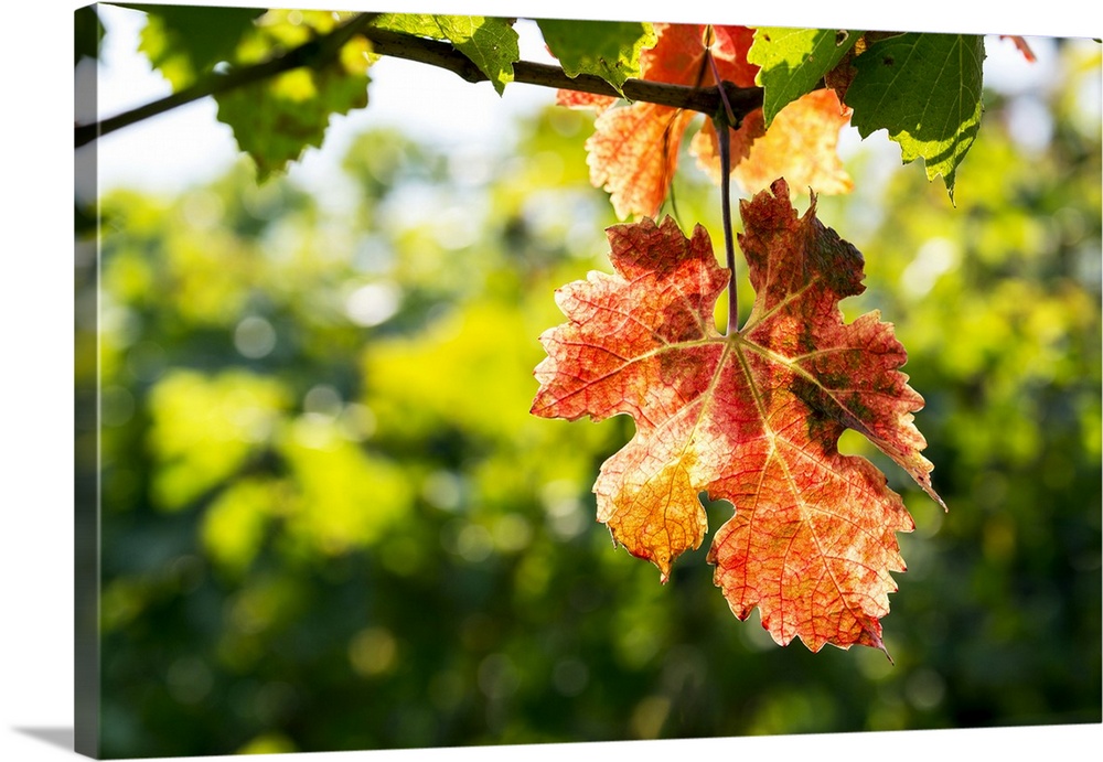 <p>Close-up of a colourful grape leaf hanging from the vine in autumn; Trento, Trento, Italy</p>