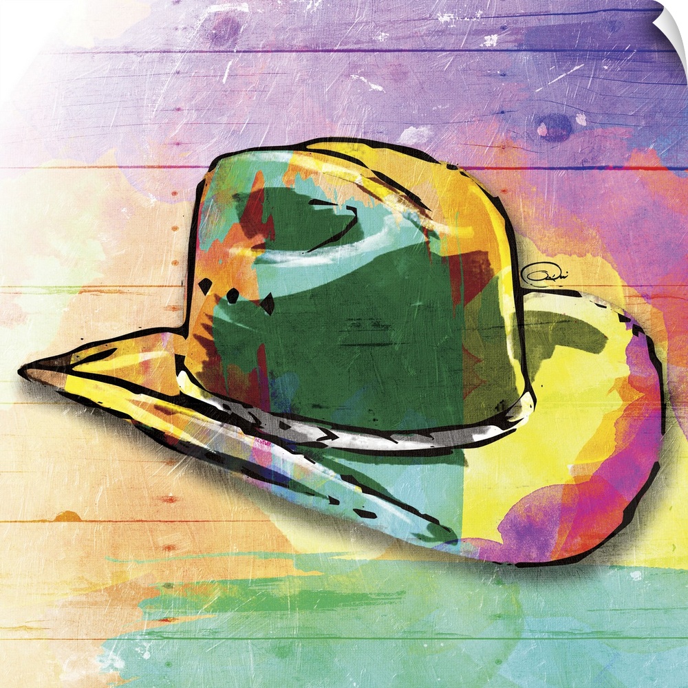 <p>A painting of a colorful cowboy hat on a multicolored wood paneled background.</p>
