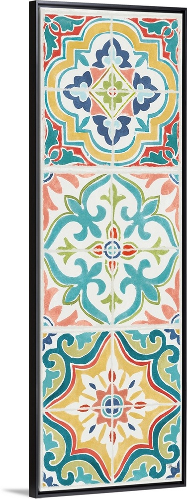 <p>Vertical artwork of square floral tile designs in cool colors of blue, green and red.</p>