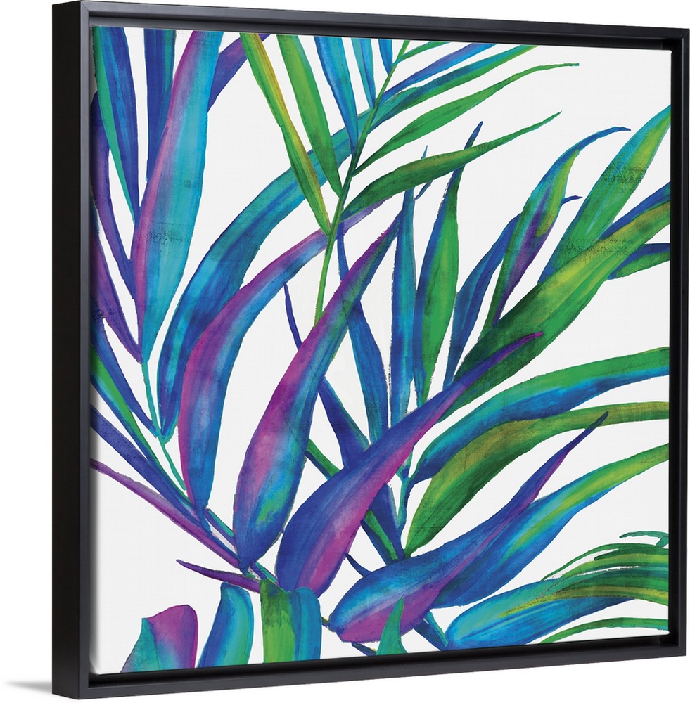 <p>Square decor with illustrated tropical leaves in blue, purple, and green hues on a white background.</p>