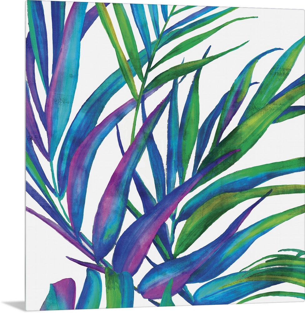 <p>Square decor with illustrated tropical leaves in blue, purple, and green hues on a white background.</p>