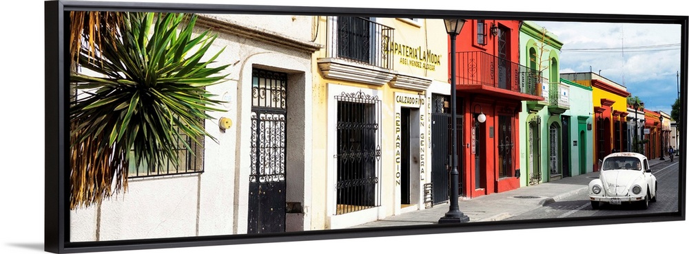 <p>Panoramic photograph of a classic white Volkswagen Beetle driving up a colorful street in Mexico. From the Viva Mexico Panoramic Collection.</p>
