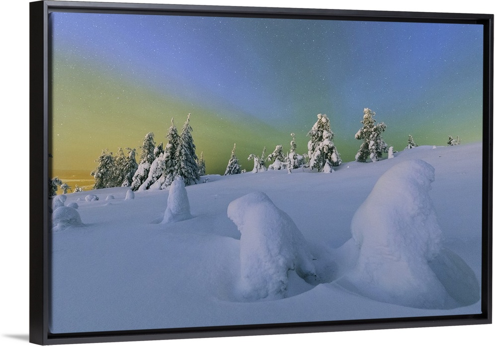 <p>Colorful Northern Lights of the Aurora Borealis and starry sky on the snowy woods, Ruka, Kuusamo, Ostrobothnia region, Lapland, Finland</p>