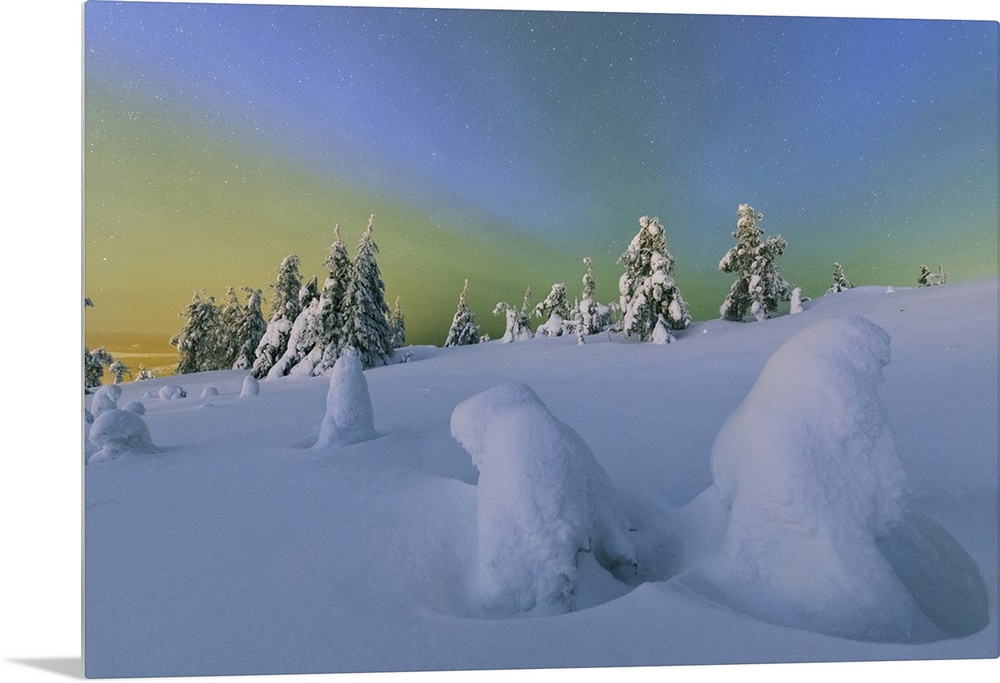 <p>Colorful Northern Lights of the Aurora Borealis and starry sky on the snowy woods, Ruka, Kuusamo, Ostrobothnia region, Lapland, Finland</p>