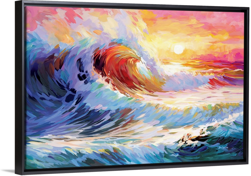 <p>A dynamic artwork of ocean waves crashing with vibrant colors, set against a glowing sunset sky, capturing the power and beauty of nature.</p>