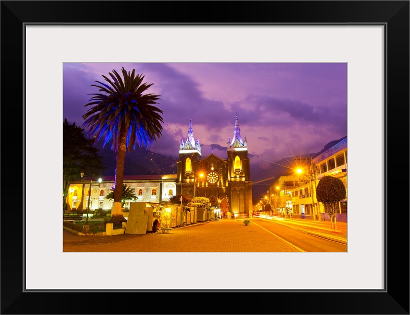 <p>Colorful pink sunset over the Church of the Virgin of the Holy Water, and the main square in Banos.</p>