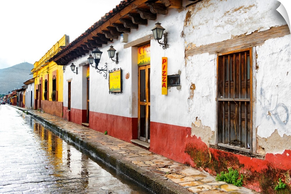 <p>Photograph of an overcast and rainy street scene by a pizza shop in Mexico. From the Viva Mexico Collection.</p>