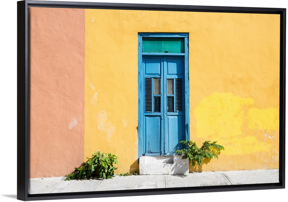 <p>Photograph of a pale yellow and pink exterior wall with a bright blue door off the street in Mexico. From the Viva Mexico Collection.</p>