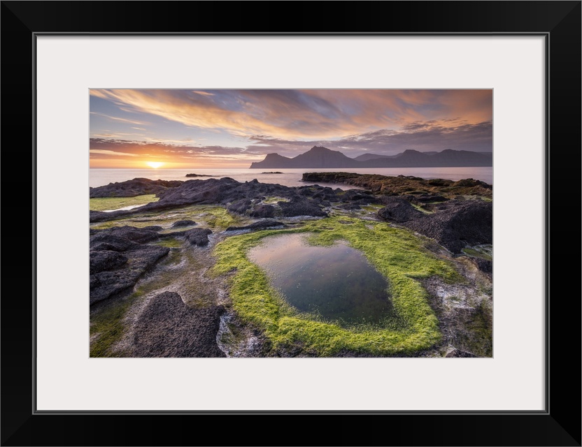 <p>Colourful summer sunrise from the rocky shores of Gjogv on the island of Eysturoy, Faroe Islands, Denmark. Summer (June) 2017.</p>