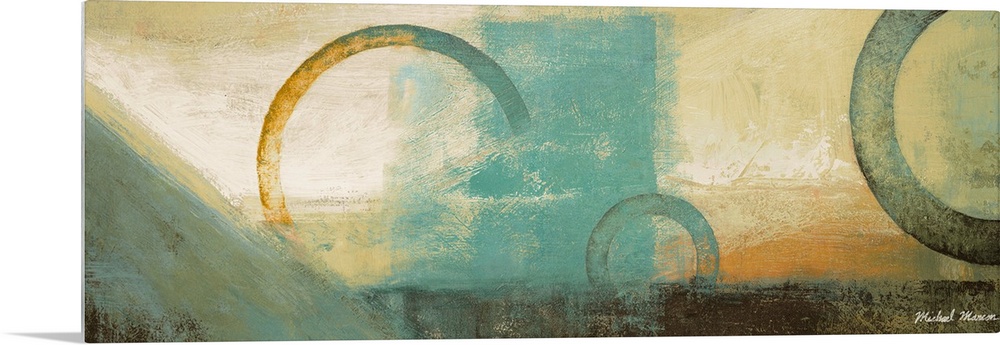 <p>Panoramic abstract artwork that uses blocks of colors and rings of different sizes over those blocks.</p>