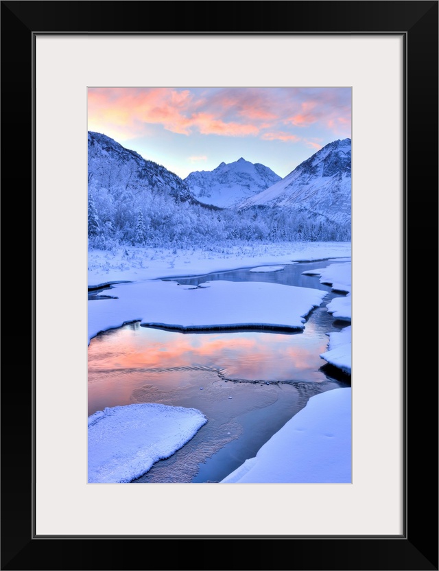 <p>Colorful sunrise over a stream at the Eagle River Nature Center in Chugach State Park, Southcentral Alaska, Winter, HDR</p>