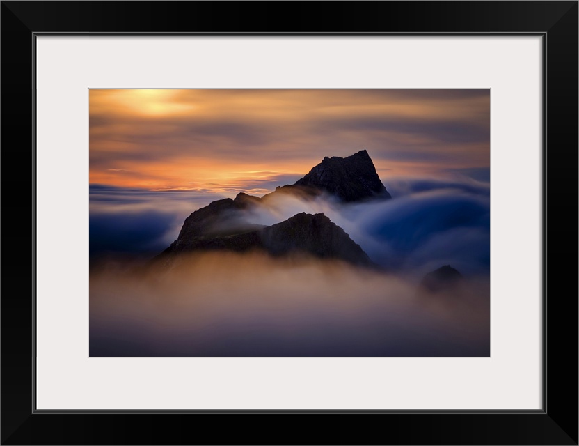 <p>Colorful sunset in foggy mountains of Moskenesoya, Lofoten, Norway</p>