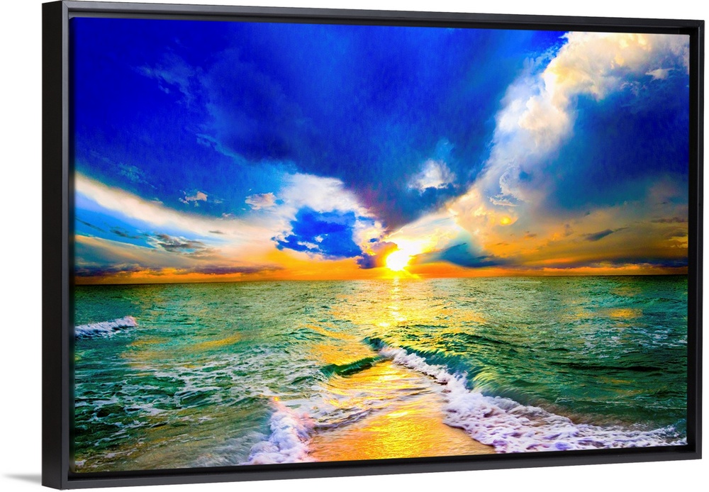 <p>This is a colorful sunset over ocean landscape. A seascape with green waves on the shore before a beautiful beach sunset with explosive sunlight through colorful blue clouds.</p>