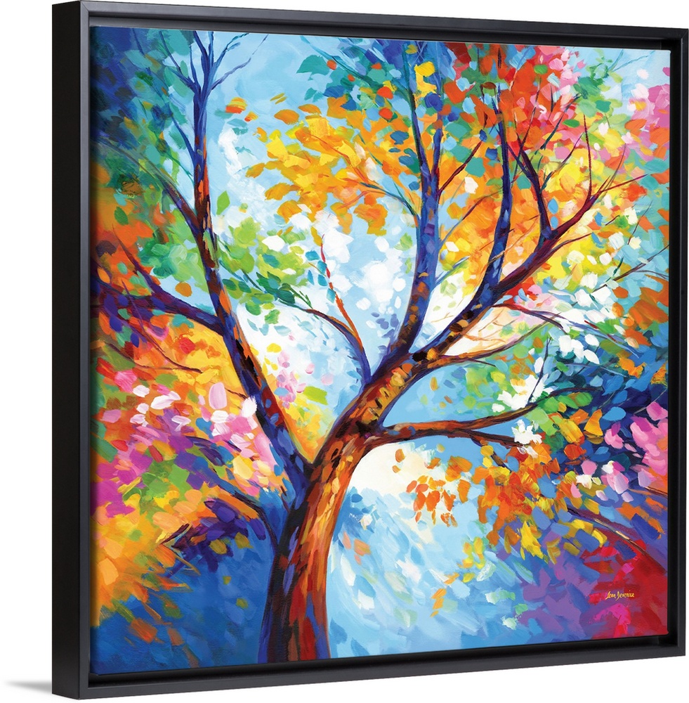<p>A contemporary artwork of a tree with colorful leaves, bursting with vibrant hues and energy, symbolizing joy and the beauty of nature.</p>