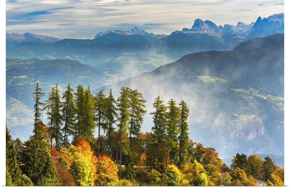 <p>Colourful trees in autumn on a ridge overlooking rolling valley alpine slopes and mountains in the background with mist coming up from the valley; Caldaro, Bolzano, Italy</p>