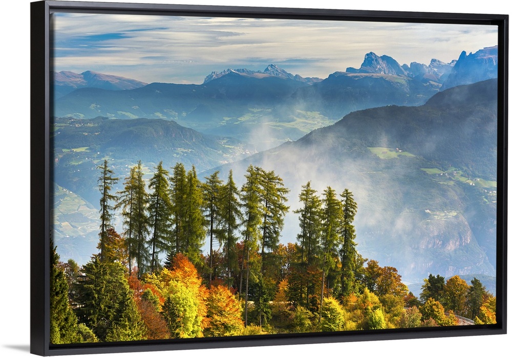 <p>Colourful trees in autumn on a ridge overlooking rolling valley alpine slopes and mountains in the background with mist coming up from the valley; Caldaro, Bolzano, Italy</p>