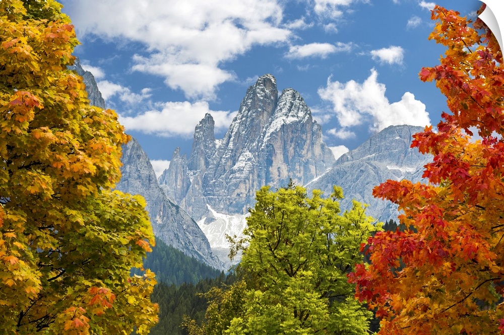 <p>Colourful trees in autumn framing dramatic mountain in the background; Sesto, Bolzano, Italy</p>
