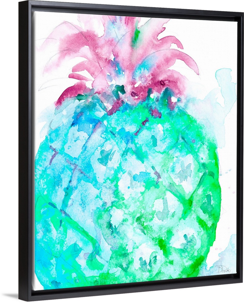 <p>Watercolor painting of a giant blue, green, and purple pineapple on a white background with some paint splatter.</p>