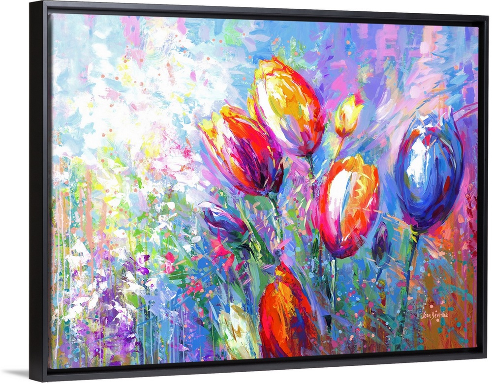 <p>This contemporary artwork bursts with the abstract beauty of colorful tulips and wildflowers, a vivid floral array that brings the untamed joy of nature into any decor setting, ideal for energizing a space with its lively hues and dynamic expression.</p>
