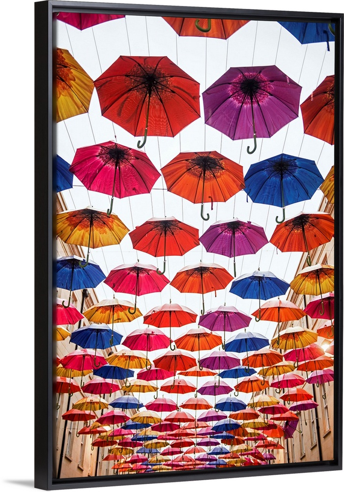 <p>Photograph of the colorful umbrellas hanging in Southgate Shopping Centre in Bath, England, UK.</p>