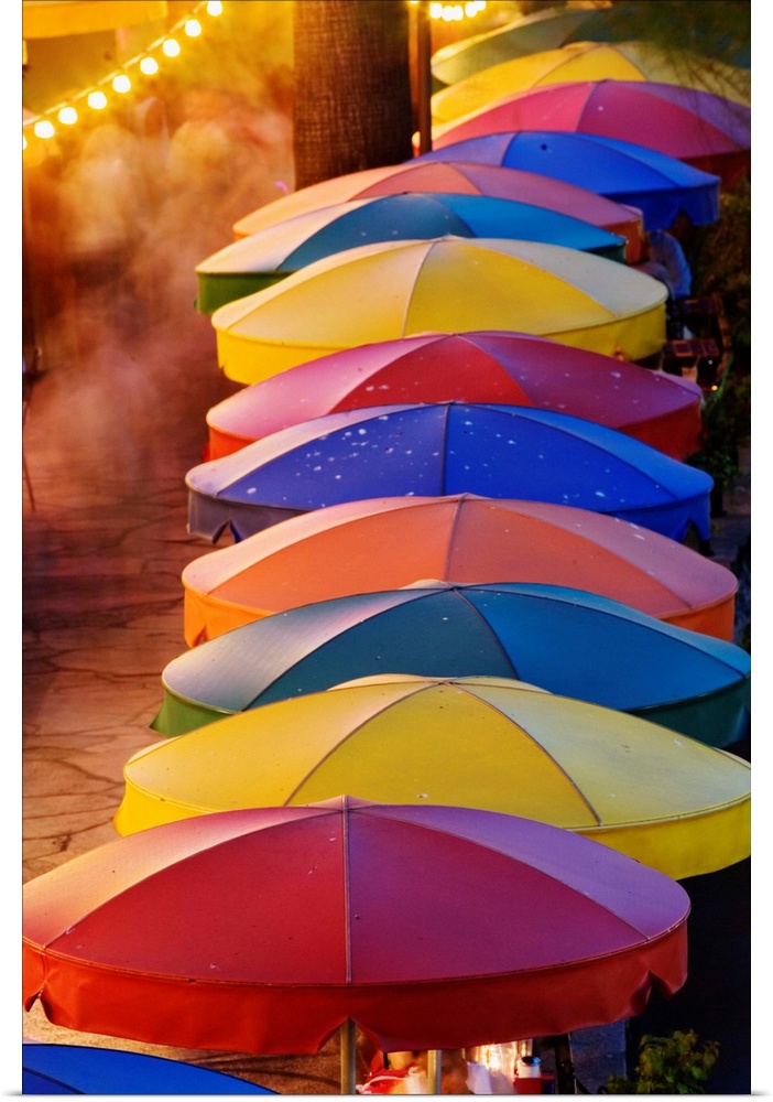 <p>Colorful umbrellas of outdoor cafe and blurred people in motion along famous River Walk and San Antonio River, San Antonio, Texas.</p>