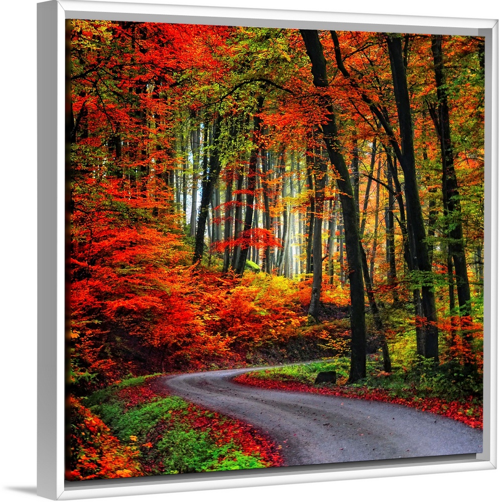 <p>Square Fine Art photograph of a winding road leading upward through a forest of vibrant fall colors.</p>