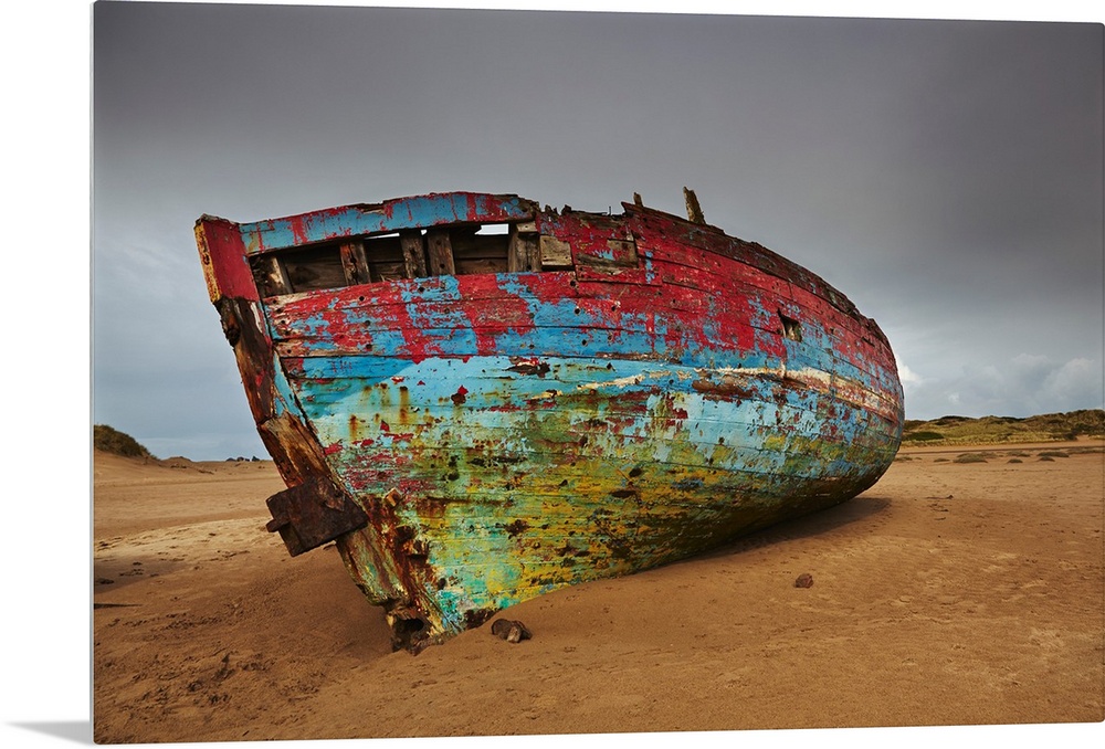 <p>Colourful weathered shipwreck lying in sand dunes at Crow Point, at the mouth of the Taw and Torridge Rivers, near Barnstaple, Devon, Great Britain, Devon, England</p>