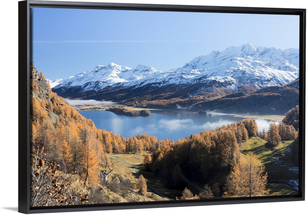 <p>Colorful woods around Lake Sils with snowy peaks in the background, Maloja, Canton of Graubunden, Swiss Alps, Switzerland, Europe</p>