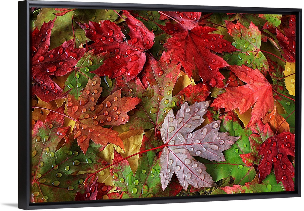 <p>Close up of leaves in brilliant fall colors, covered in water droplets.</p>