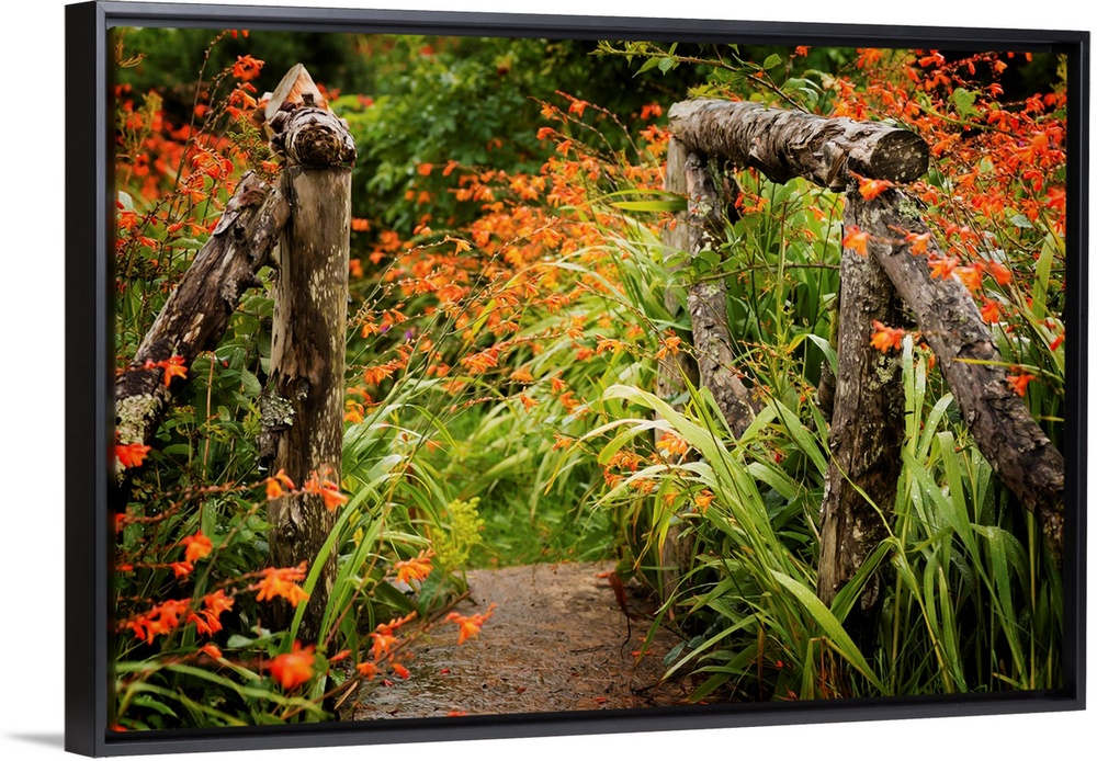<p>Fine art photo of a garden path with bright flowers and a wooden gate.</p>