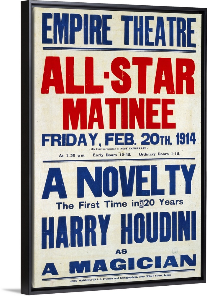 <p>Colour lithograph, poster format, advertising Harry Houdini's first novelty in 20 years. Houdini, was a Hungarian-American illusionist and stunt performer, noted for his sensational escape acts. Dated 1914.</p>