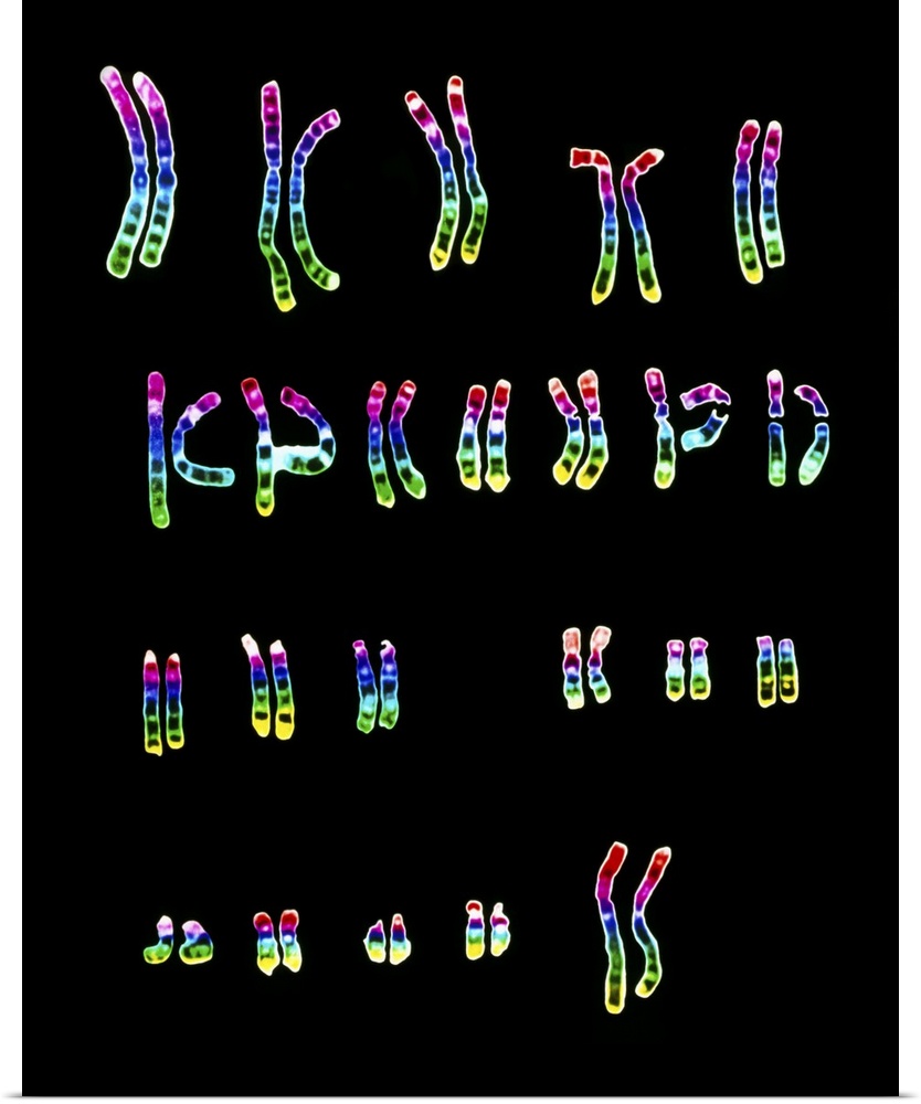 <p>Female chromosomes. Light micrograph of a normal female karyotype, the full complement of female chromosomes arranged in numbered homologous pairs. They are numbered 1-23 from top left to bottom right, the last pair being the sex chromosomes. They are obtained by matching unpaired chromosomes during the metaphase stage of cell division. Each member of a homologous pair is similar in length</p>