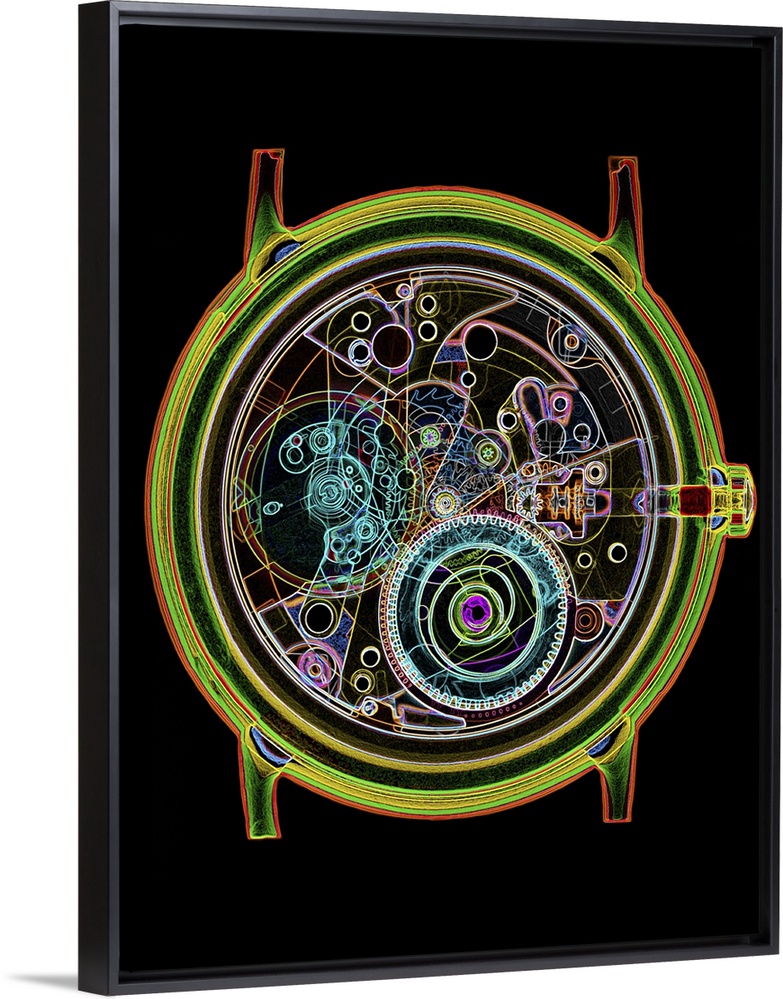 <p>Wrist-watch. Coloured X-ray of a 17-jewel wrist- watch, showing the internal mechanism. Internal cogs and gears of the watch escapement can be seen. Some of the small circles contain ruby jewels used in bearings. An escapement is a device within a watch which provides periodic impulses to the balance wheel that helps to regulate time- keeping. Jewels, whether natural or man-made, are used in watch bearings because their smooth surfaces offer little friction resistance and are hard-wearing.</p>